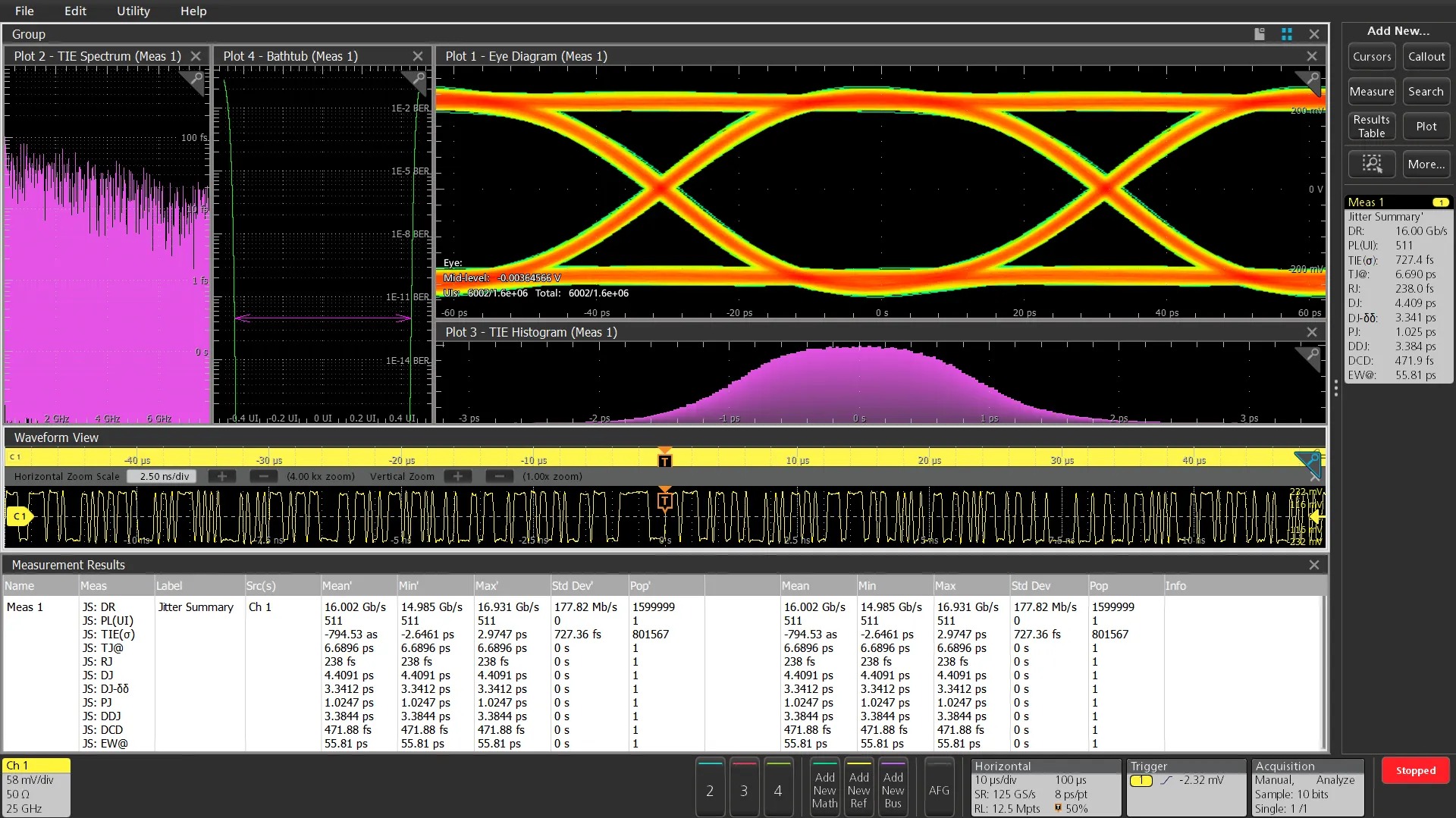 Easy one button Jitter Measurement Summary provides comprehensive data including key plots, diagrams and measurements quickly on one channel or multiple channels at the same time